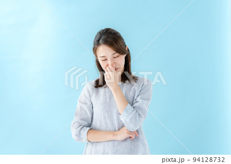 一個女人捂著鼻子藍背
