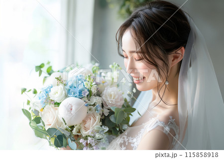新娘靠在她的花束上