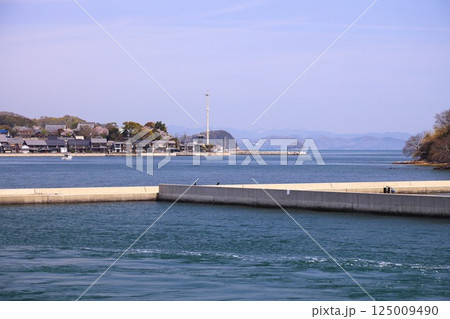 Lighthouse And Fishing Boat Over The Calm Sea. Background.