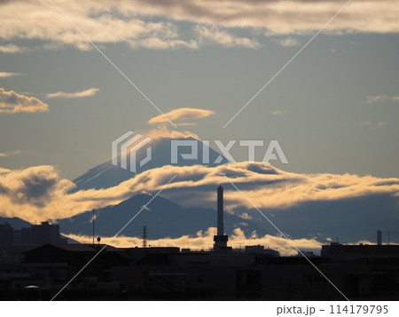 從川口市荒川堤防看到白雲覆蓋的富士山