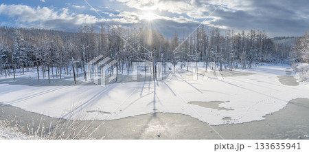 Snow scene of Biei Green Pond in Hokkaido, Japan in winter
