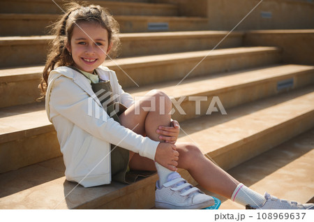 Authentic Caucasian little girl with skateboard, smiles cutely looking at camera, sitting outdoors on steps