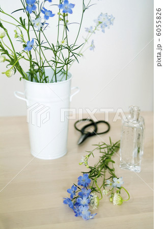 藍色背景和毛茛屬,香豌豆花和鞋帶花