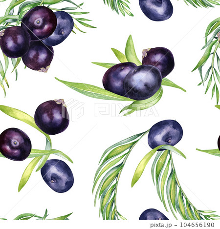 Acai berries and palm leaves watercolor seamless pattern isolated on white. Exotic amazon small purple berries, tropical fruit hand drawn. Design for packaging, wrapping, textile, background, paper