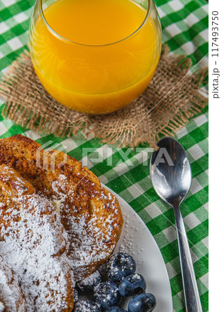 Sweet toast with ricotta cheese, honey and peach on a wooden board, Food recipe background. Close up