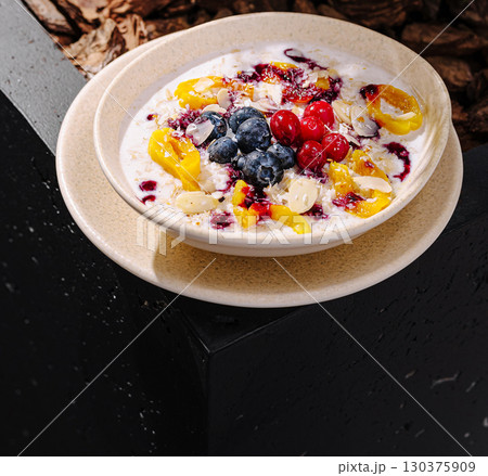 Colorful bowl of yogurt topped with fresh fruit on a sunny day