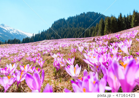 Blooming purple violet Crocus heuffelianus (Crocus vernus) alpine flowers on spring Carpathian mountain plateau, Ukraine.