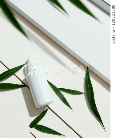 Minimalist product shot: a white bottle surrounded by green leaves on a white wooden surface.
