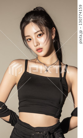 Korean model poses confidently in casual black outfit during studio photoshoot in natural light