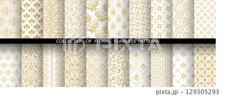 Geometric floral set of seamless patterns. White and golden vector backgrounds. Damask graphic ornaments
