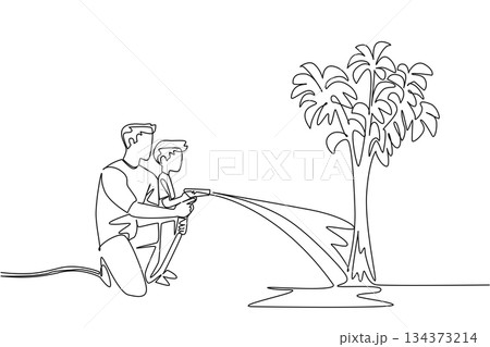 A father and son water tree using garden hose in one line drawing style, representing nature concept, physical outdoor activity, family connection, and celebration of National Gardening Exercise Day.