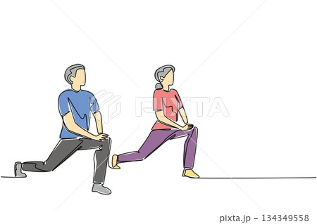 Single continuous line drawing a pair of grandparents are doing fitness on a fitness mate. Keep up the spirit of exercising. National Senior Health and Fitness Day. One line design vector illustration