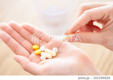 年輕的亞洲女性服用藥物、補充劑、維生素、抗脹氣藥