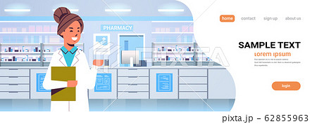 female doctor pharmacist with clipboard modern pharmacy drugstore interior medicine healthcare concept horizontal portrait copy space