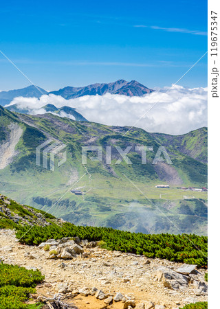 從北阿爾卑斯山劍禦前的登山道上看到的雲海和藥師山。