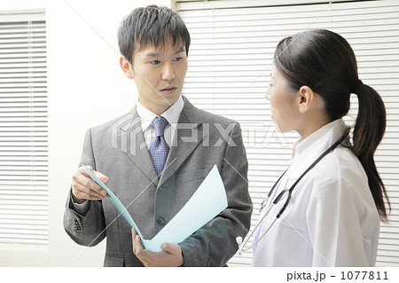 一名白大褂的醫生和一名穿著西裝的MR女人在醫院排隊