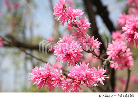 碧藍的天空下,盛開著粉紅色的重瓣梅花。