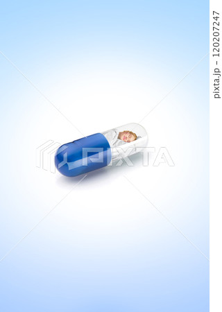 Young girl peacefully resting, sleeping inside giant capsule, symbolizing rest, medication, and healing. Contemporary art collage.