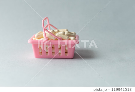 Concept of healthcare and medicine. White bottle container with medication capsules