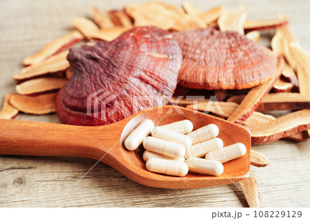Lingzhi or Reishi mushroom with capsules, organic natural healthy food.