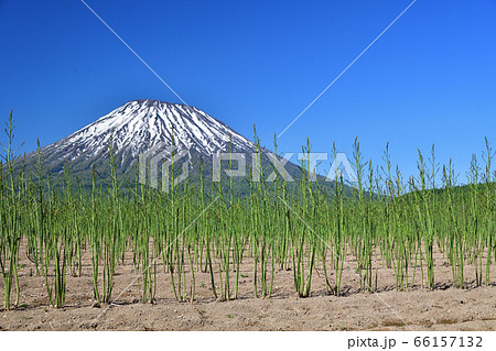 在湛藍的天空的背景下拍攝蘆筍田和羊蹄山(富士山三岳)的仲夏風景