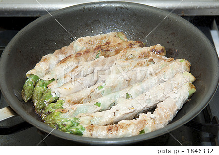 培根包裹蘆筍在煎鍋裡煎的插圖