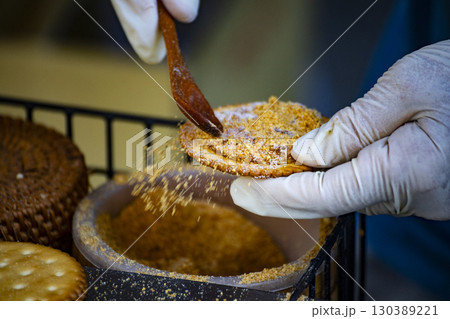 以前後景背景呈現出美味金黃色牛軋蘇打餅特寫