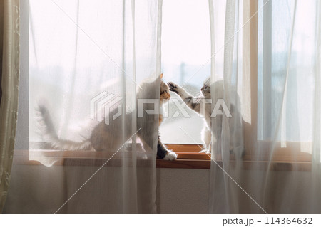 一隻可愛的蘇格蘭折耳貓小貓透過破牆上的一個洞請求握手。