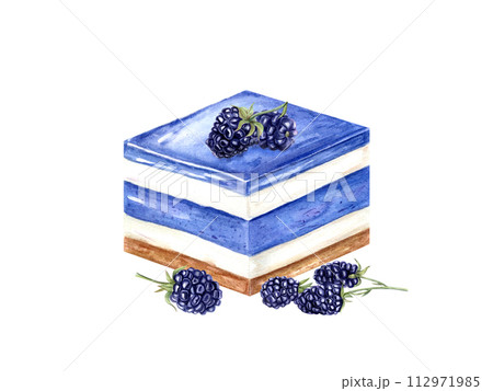 Square cake with berry yoghurt cream. White and blue mousse. Ripe blackberries on dessert. Slice of cheesecake, tart. Watercolor illustration isolated on white. For recipe, menu, package design