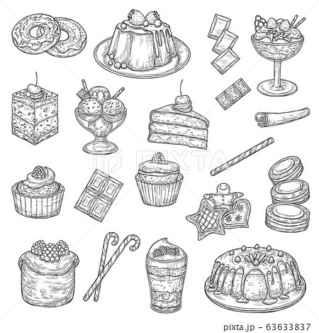 Cakes, cheesecakes, dessert sweets cupcakes sketch