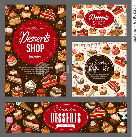 Pastry cakes, desserts, bakery shop sweet cupcakes