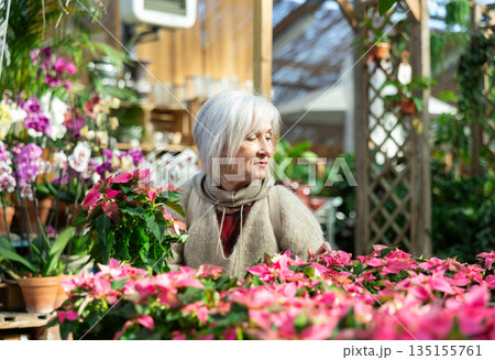Mature woman customer-onlooker curiously examines showcase exhibition with indoor plant poinsettia