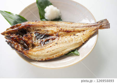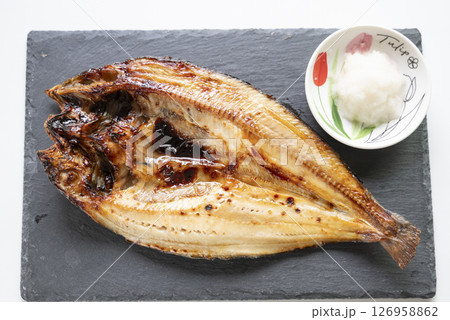 用鹽烤的阿特卡鯖魚盛放在裝飾盤中