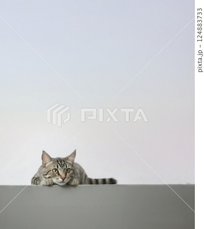 Close up gray cat house is want to sleep on the old wall near the garden at thailand