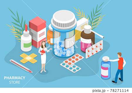 Isometric Vector Conceptual Illustration of Pharmacy Store.