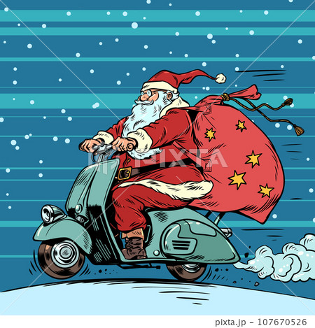 Christmas is coming closer on two wheels. Santa Claus rides a moped with a bag of gifts. Upcoming holidays and seasonal sales along with it. Pop Art Retro