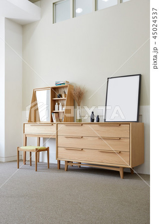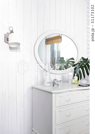 A modern luxurious bathroom table features a toiletry set and space for displaying products.