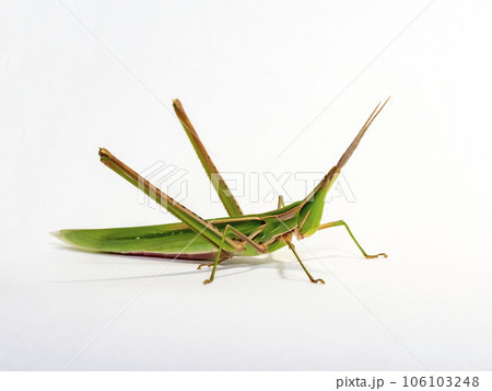 Closeup on a large green Mediterranean cone-headed grasshopper, Ruspolia nitidula