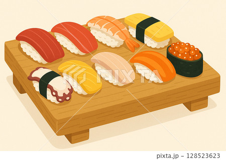 壽司木屐上擺放的各種壽司的插圖