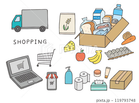 與網路超市相關的手繪插圖集(單色)