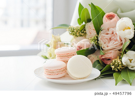 Elegant sweet macarons and pastel colored beige flowers