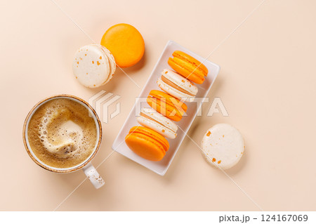 Concept of tasty dessert with macarons on orange background
