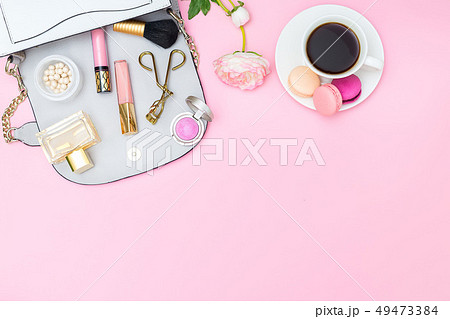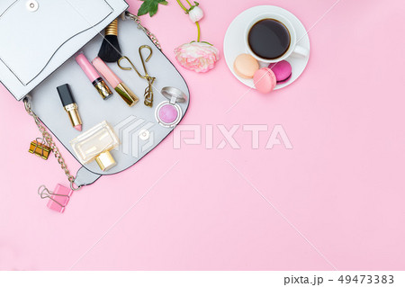 Women's handbag and accessories on a pink