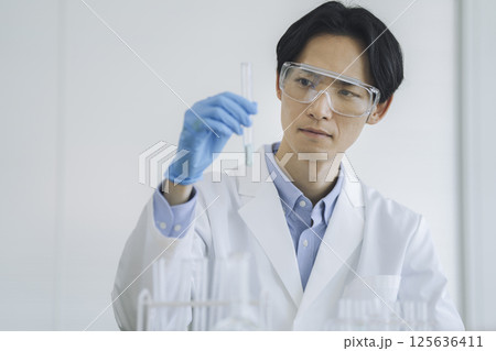 一名身穿白大褂的男子正在用試管工作,實驗影像