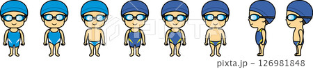 Set for training and learning to swim in the pool and open water on a blue background, top view with free space