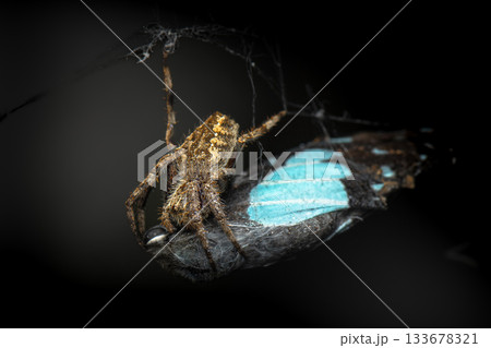spider on a web catches a fly and wraps