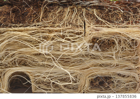 Macro view of white chives roots and soil texture