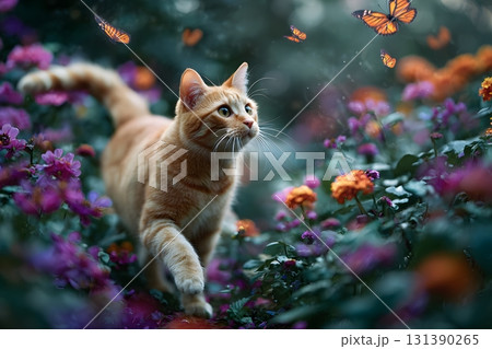 A cute cat walks among colorful flowers with butterflies flying around it.