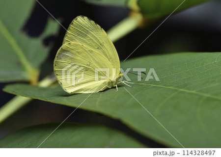 寬邊黃粉蝶棲息在綠色葉子特寫