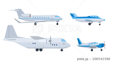Cartoon set of civil, cargo, private aircraft. Vector illustration isolated on white background